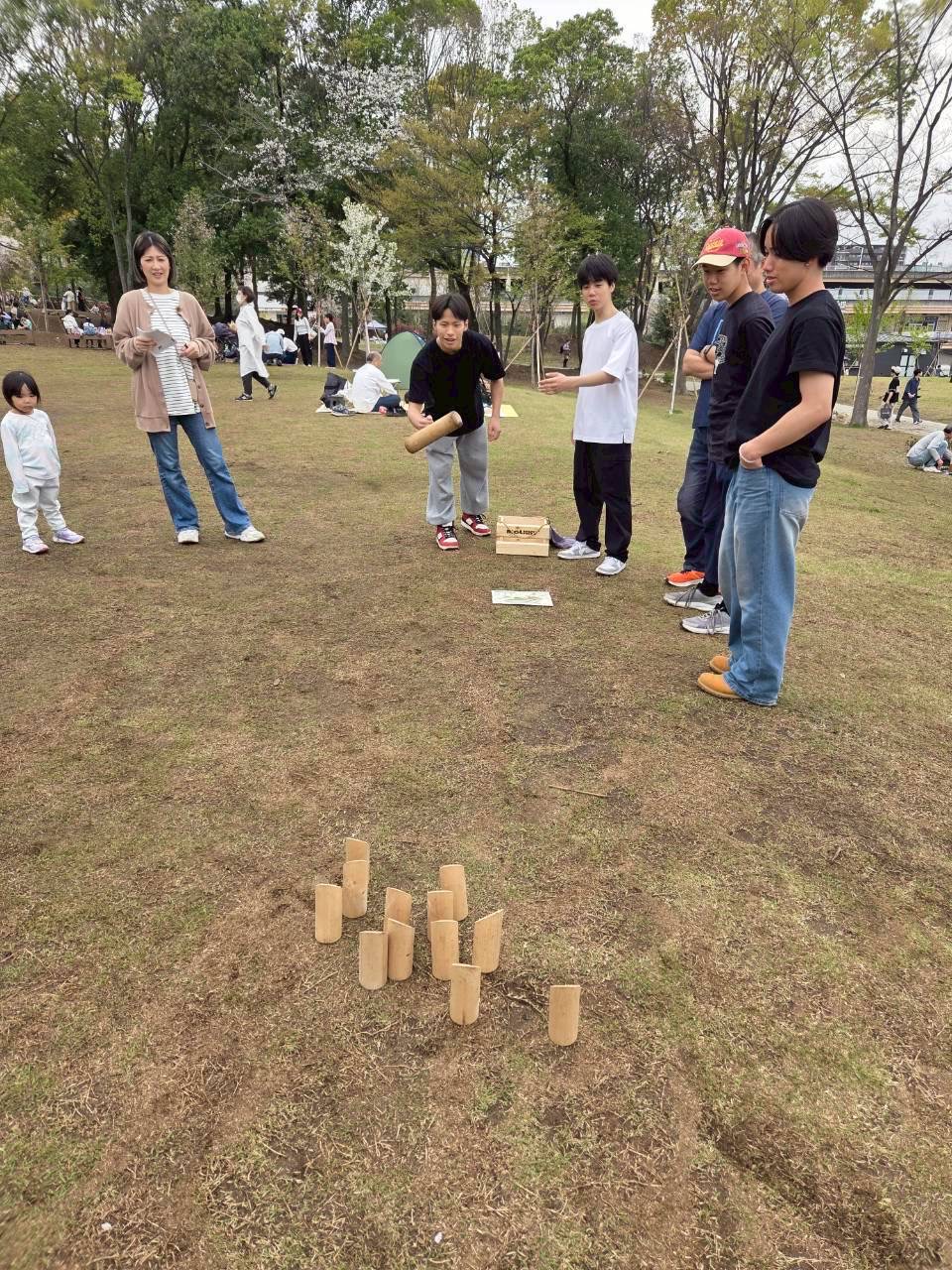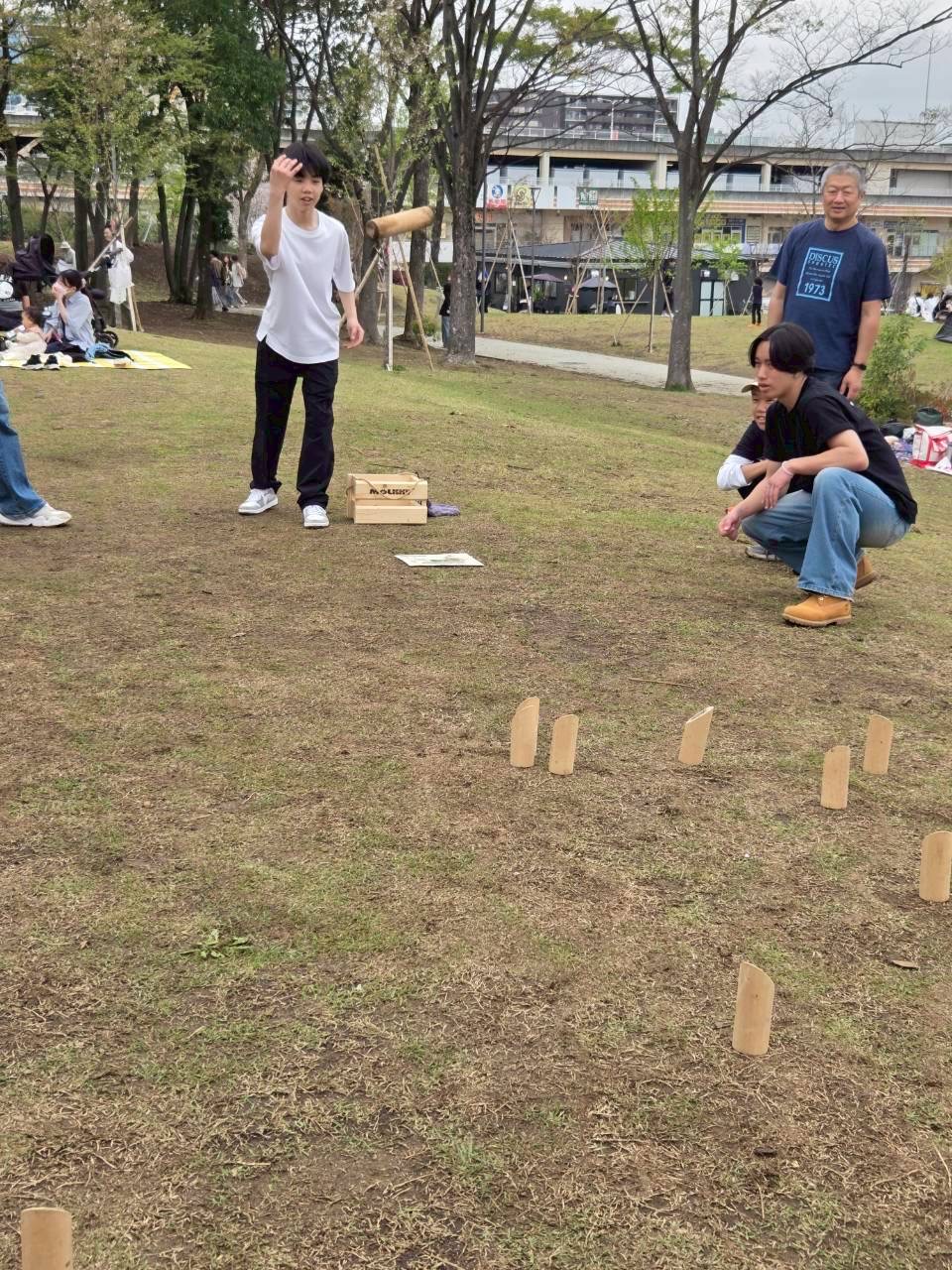今回のお楽しみのひとつが、**モルック**というフィンランド発祥の木製ゲーム。木の棒(スキットル)を投げて番号が書かれた駒を倒し、合計50点を目指すシンプルなルールですが、これが意外と奥深い。大人も子どもも本気になって白熱した勝負が繰り広げられました。